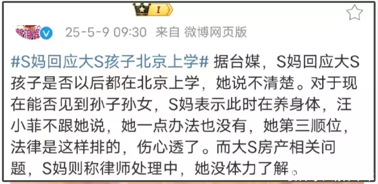 S妈之前还对着媒体“算账”,说大S之前说过挣钱就是给她花的,后面被问到孩子的问题,她也强调自己是“第三顺位”,后来更是被爆料深夜找汪小菲要钱。