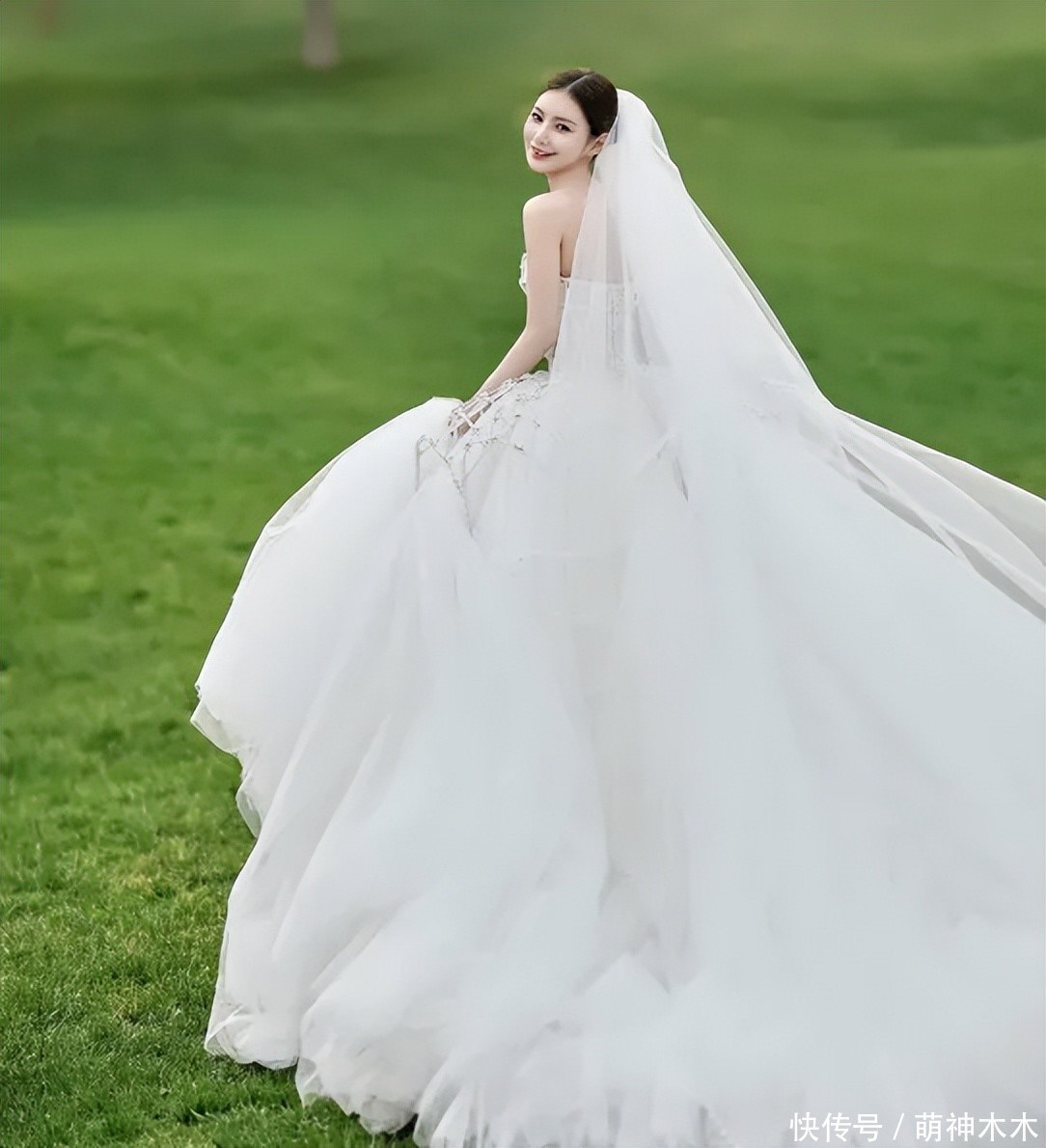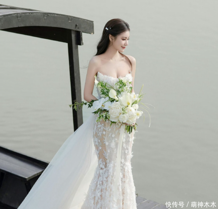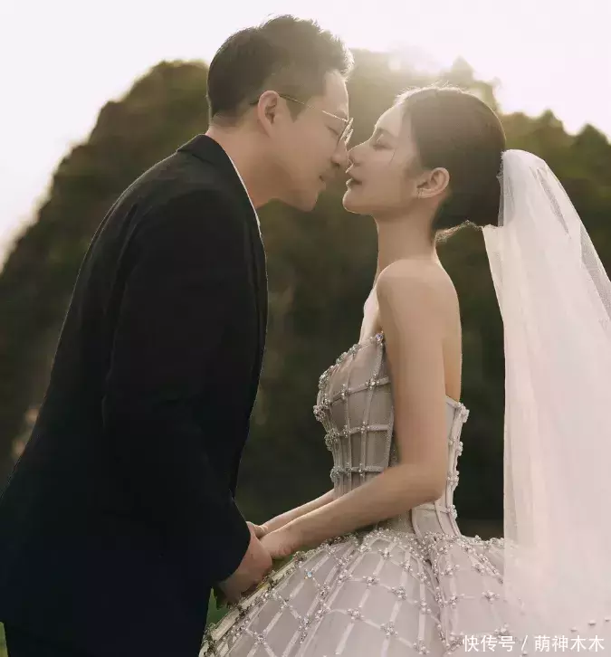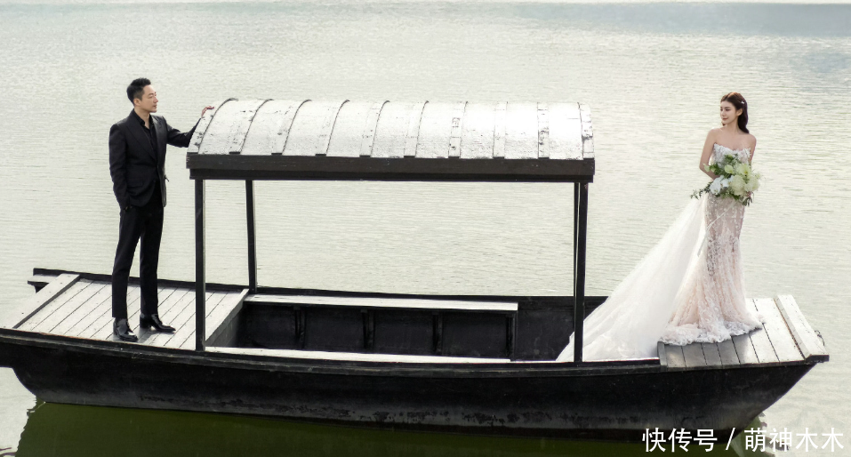 另一套婚纱则是繁复的大裙摆样式,马筱梅回眸一笑,很有韵味。两人携手相贴,画面也很温馨浪漫。