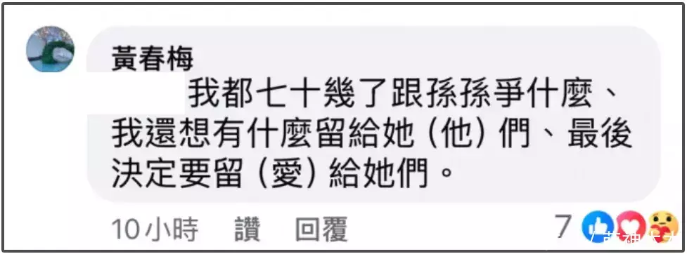 汪小菲和大S的前段婚姻到底是谁包容谁吃亏倒是说不准,但张兰说“爱不是生意经”,却无意间戳中S妈此前回应网友的言论。S妈回应网友是否要和外孙争产的问题,说自己都70多岁了“跟孙孙争什么,我还想有什么留给她(他)们,最后决定要留爱给她们。”